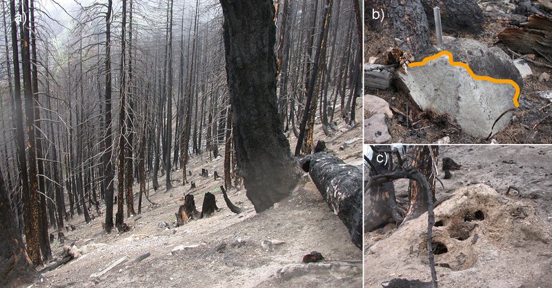 Abb. 1 - Bilder der Brandfläche Leuk (VS) einige Wochen nach dem Feuer von 2003: a) mit weisser Asche bedeckte Fläche, ein Anzeichen für die vollständige Verbrennung der Humusauflage und damit für ein starkes Feuer; b) Felsen mit scharfer Grenze der verbrannten Humussauflage. Oberhalb der orangen Linie ist der Fels als Folge des Feuers schwarz gefärbt; c) wahrscheinliches Überbleibsel eines Ameisennestes. Anklicken zum Vergrössern. Foto: Marco Moretti (WSL)