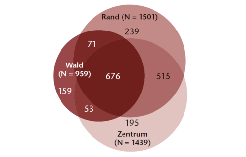 Auf der Brandfläche wurden signifikant mehr Arten gefangen als im Wald. Die Hälfte aller Arten (n = 949) trat ausschliesslich in der Brandfläche auf (Abb. 4). Im Gegensatz dazu fanden sich nur 159 Arten (8.4%) ausschliesslich im Wald. 800 Arten (42%) kamen sowohl auf der Brandfläche als auch im Wald vor. Die Anzahl der Individuen (und damit in etwa auch die Biomasse) folgte einem ähnlichen Muster.