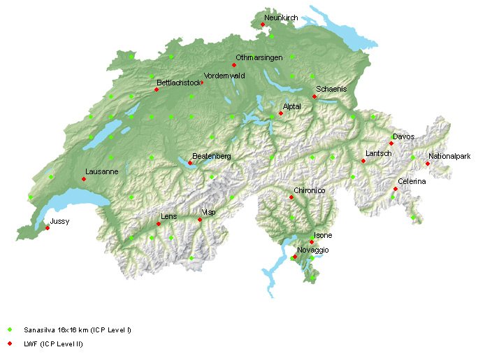 Abb. 1 - Karte der Beobachtungsflächen: seit 1985 beobachten Wissenschaftler den Gesundheitszustand der Bäume in der Schweiz (Snasilva-Inventur), und seit 1994 findet die Langfristige Waldökosystem-Forschung LWF statt.