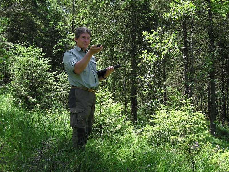 Abb. 2: Andreas Walter vom Regionalen Natura 2000-Kartierteam in Schwaben überprüft die vorläufige Lebensraumtypenkarte im FFH-Gebiet "Ammergebirge" (Foto: B. Mittermeier).