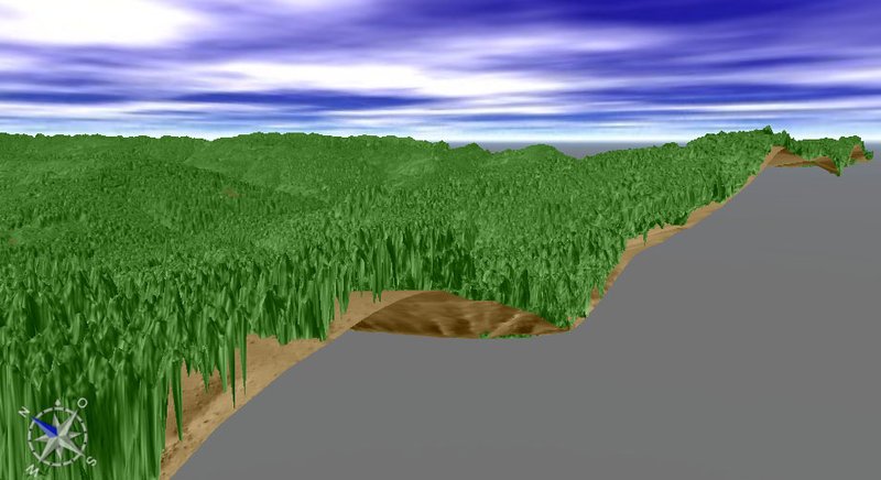 Abb. 3: Auf der Basis von flugzeuggestützten Laserscanning-Daten kann die Landbedeckungsform (hier: Wald) anhand ihrer Höhe wirklichkeitsgetreu auf einem hochgenauen Modell des Geländes dargestellt werden.