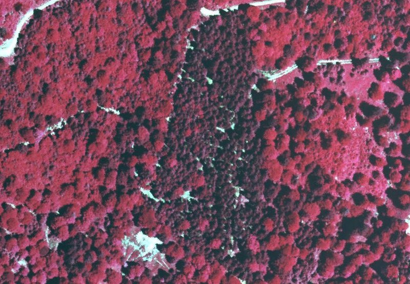 Abb. 1: Dunkel erscheinende Nadelbäume und helle Laubbäume lassen sich im CIR-Luftbild gut unterscheiden (Foto: B. Grubert).