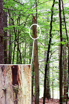 Baumhöhlen stellen eine Schlüsselstruktur für eine Vielzahl von Lebewesen in Wäldern dar. Im Rahmen des Bergmischwaldprojektes fanden die Forschenden durchschnittlich 1,5 Höhlenbäume bzw. 2,5 Höhlen je Hektare.