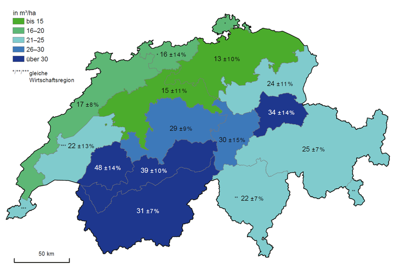 In der Schweiz beträgt das Totholzvolumen (Schaftholz ab 12 cm BHD) gemäss LFI4 durchschnittlich 24,2 m3/ha, wovon etwa die Hälfte (11,8 m3/ha) auf stehende tote Bäume entfällt. Allerdings ist das Totholz sehr unterschiedlich verteilt. Am höchsten ist sein Volumen mit 48 m3/ha in den westlichen Voralpen, am tiefsten mit 13 m3/ha im östlichen Mittelland (Abb. 7). Das Totholz hat seit dem LFI3 weiterhin zugenommen, auch nach dem grossen Sprung zwischen LFI2 und LFI3 bedingt durch den Sturm Lothar, der das Totholzvolumen glatt verdoppelt hatte. Die in der Waldpolitik 2020 angestrebten Totholzvolumen von 20 m3/ ha (Jura, Mittelland, Alpensüdseite) bzw. 25 m3/ha (Voralpen, Alpen) sind aktuell in drei der fünf Produktionsregionen erreicht.
