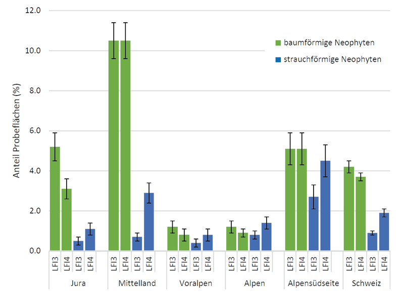 Eingeführte Straucharten kommen derzeit deutlich seltener vor als eingeführte Bäume. Ihre Entwicklung war aber vom LFI3 zum LFI4 ausgesprochen dynamisch. So hat sich ihre Präsenz auf den Probeflächen gesamtschweizerisch verdoppelt (von 0,9% auf 1,9% der Probeflächen), im Mittelland gar vervierfacht von 0,7% auf 2,9% (Abb. 6). Eine solche eingeführte Art ist der Sommerflieder. Dieser wurde im LFI3 auf 9 der insgesamt rund 6500 Probeflächen gefunden, im LFI4 aber bereits auf deren 50.