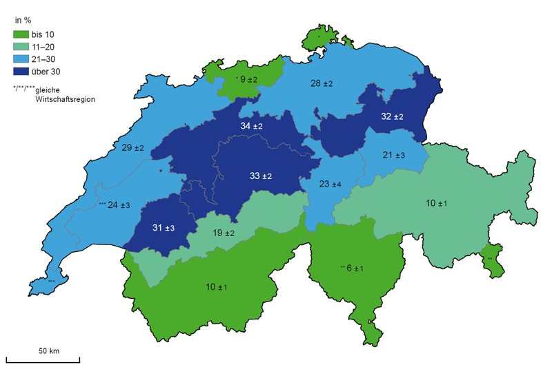 6% der Schweizer Waldfläche wurden seit etwa 100 Jahren weder bewirtschaftet noch beweidet, 20% in den letzten 50 Jahren nicht mehr forstlich genutzt. Den grössten Anteil hat diese Art von Waldwildnis auf der Alpensüdseite (56%), gefolgt vom Wallis mit 39% (Abb. 8). Im intensiv bewirtschafteten Mittelland liegt der Anteil dagegen bei 2%.