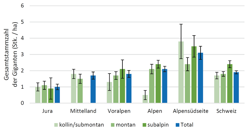 Über die ganze Schweiz sind derzeit 1,9 Giganten pro Hektare vorhanden (Abb. 5). Mit Abstand am höchsten ist die Gigantendichte auf der Alpensüdseite, wo sie im Durchschnitt 3,1 Stück/ha und in der kollinen/submontanen Stufe wegen der historischen Kastanienwirtschaft gar 3,8 Stück/ha beträgt. Im Vergleich dazu gibt es in den anderen Produktionsregionen eher wenige Giganten (1,0 bis 2,1 Stück/ha).