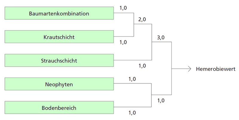 Die Bestimmung der Hemerobie ist so aufgebaut: Zuerst berechnet man für jede einzelne Testfläche die Hemerobiewerte von fünf Einzelkriterien, die dann zu einem Gesamthemerobiewert verknüpft werden (Abb. 2). Der Gesamtwert stellt dann den Grad der menschlichen Beeinflussung auf der jeweiligen Testfläche zusammenfassend dar. Bei den fünf Einzelkriterien handelt es sich um drei Kriterien, welche die drei Vegetationsschichten (Baum-, Strauch- und Krautschicht) bewerten und um zwei weitere Kriterien, die anthropogene Einflüsse mit einbeziehen (Neophyten, Boden).