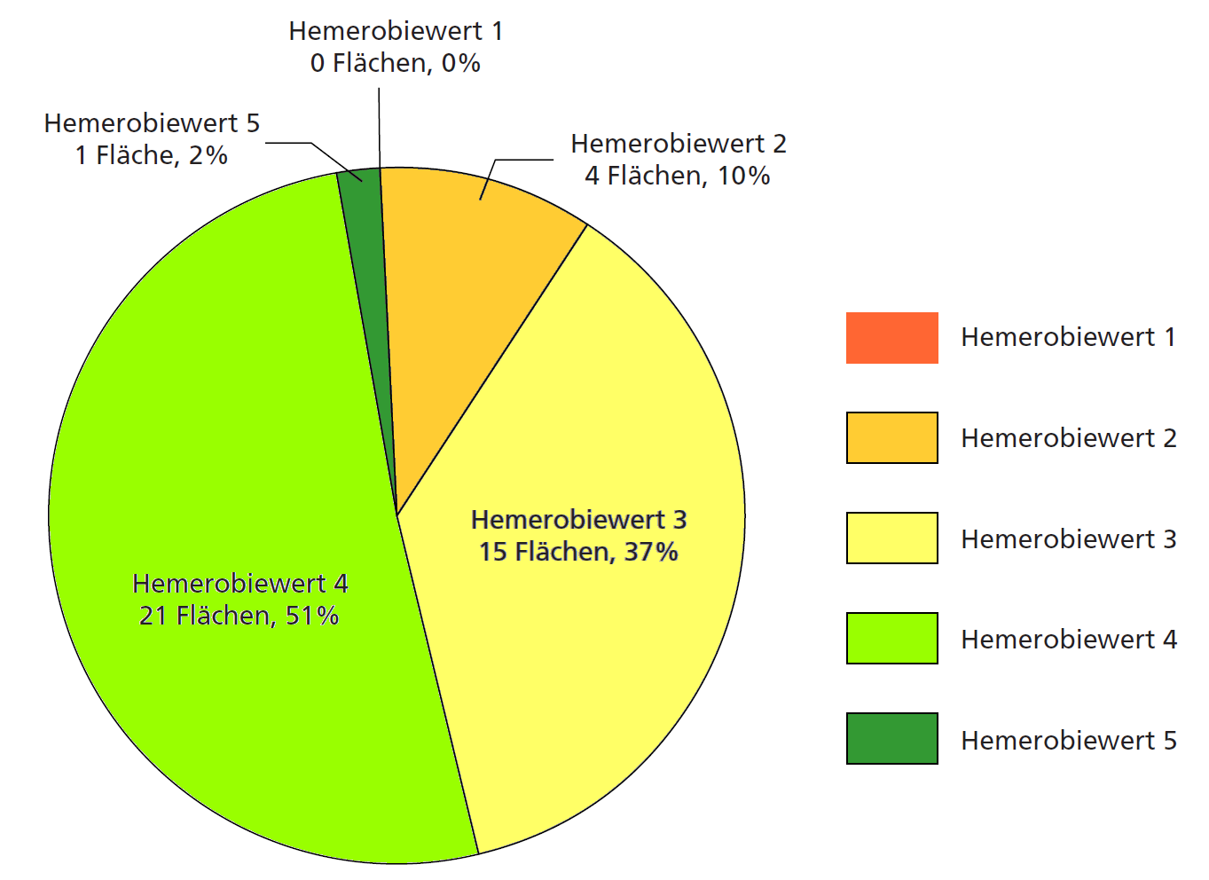 Abbildung 4 gibt einen Überblick über die Verteilung der 41 Testflächen auf die fünf Hemerobiestufen. Die Hemerobiestufe 1 (künstlich, aktuelle Vegetation hat nichts mit der potenziell-natürlichen Vegetation gemeinsam) wurde erwartungsgemäss kein einziges Mal vergeben, denn bei der Auswahl der Testflächen wurden solche künstlichen Flächen (z.B. Fichtenhorste auf Buchenwaldstandorten) gezielt ausgeklammert. Dass nur gerade eine Fläche in die Hemerobiestufe 5 fällt (natürlich), ist ebenfalls nicht sonderlich erstaunlich, denn durch die Forstwirtschaft, die intensive Freizeitnutzung, die Nähe von Siedlungen und Gärten oder den Einfluss von Wegrändern treten praktisch überall mehr oder weniger grosse Abweichungen von der potenziell-natürlichen Vegetation auf.