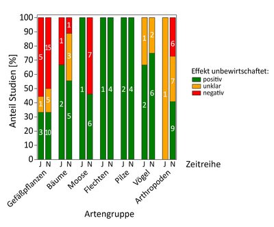 Abb. 5: Ergebnisse aus Vergleichsstudien bewirtschafteter und unbewirtschafteter mitteleuropäischer Laubwälder im Hinblick auf die Artenvielfalt (J = Zeitreihen, N = Space-for-time-Untersuchungen). Die Zahlen in den Säulen geben die absolute Anzahl der Ergebnisse mit positiven, negativen und unklaren Effekten der Nutzungseinstellung je Artengruppe an. Grafik: NW-FVA