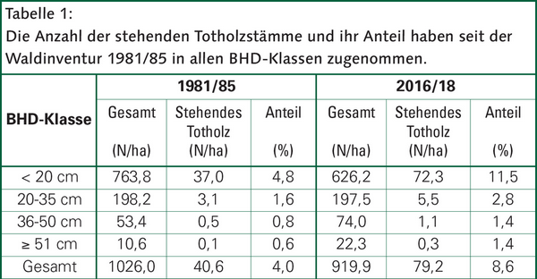 Die Anzahl der stehenden Totholzstämme und deren Anteil an der Gesamtstammzahl haben sich seit den Achtzigerjahren in etwa verdoppelt. Die Zunahme zeigt sich in allen Durchmesserklassen.