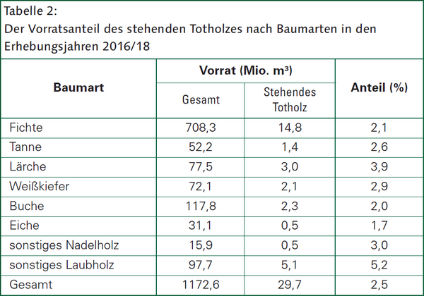 Der Vorratsanteil von Dürrlingen ist aufgrund unterschiedlicher Mortalität, Totholzentnahme sowie Zersetzungsgeschwindigkeit nach Baumarten verschieden. Nadelbaumarten weisen nach den aktuellen Ergebnissen einen etwas größeren Totholzanteil auf als Laubbaumarten wie Buche und Eiche (Tabelle 2).