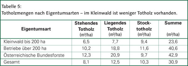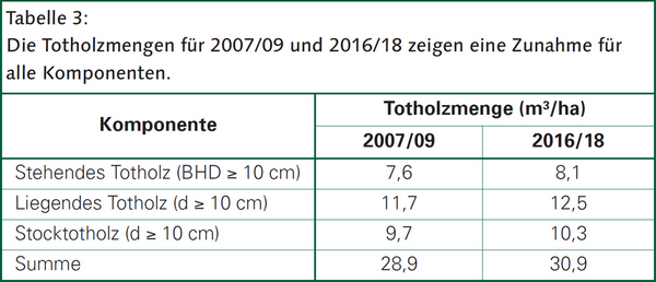 Einen wesentlichen Teil zur Totholzmenge tragen das liegende Totholz und die Stöcke bei. Beide Totholzkomponenten unterscheiden sich ökologisch vom stehenden Totholz, sie werden von anderen Arten besiedelt und die Zersetzung läuft aufgrund des Kontakts mit dem Waldboden und der Bodenfeuchte rascher ab. Aktuell beträgt die durchschnittliche Totholzmenge im österreichischen Ertragswald 30,9 m³/ha, berücksichtigt sind darin alle Komponenten ab einem Mindestdurchmesser von 10 cm. Davon entfallen rund 40 Prozent auf liegendes Totholz, 35 Prozent auf Stöcke und 25 Prozent auf stehendes Totholz. Alle drei Kategorien haben seit 2007 zugenommen (Tabelle 3).