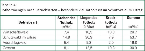 Die größten Mengen an Totholz findet man im Schutzwald im Ertrag, wobei das stehende und liegende Totholz mit 14,9 und 30,9 m³/ha besonders hohe Werte aufweisen. Im Wirtschaftswald befinden sich im Mittel 28,7 m³/ha, davon etwa gleiche Mengen an liegendem Totholz und Stöcken mit 10,5 und 10,8 m³/ha und einer geringeren stehenden Totholzmenge von 7,4 m³/ha.