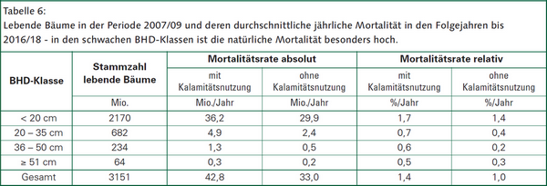 In den vergangenen zehn Jahren betrug die natürliche Mortalität im Ertragswald durchschnittlich 13 Stämme pro Jahr und Hektar, einschließlich der tendenziell unterschätzten Schadholznutzungen. Ohne die Schadholznutzungen beträgt die natürliche Mortalität jährlich rund 10 Stämme pro Hektar. Die natürliche Mortalität hängt stark vom Durchmesser ab, sie ist in der untersten BHD-Klasse am höchsten und verringert sich deutlich mit zunehmendem Durchmesser (Tabelle 6).