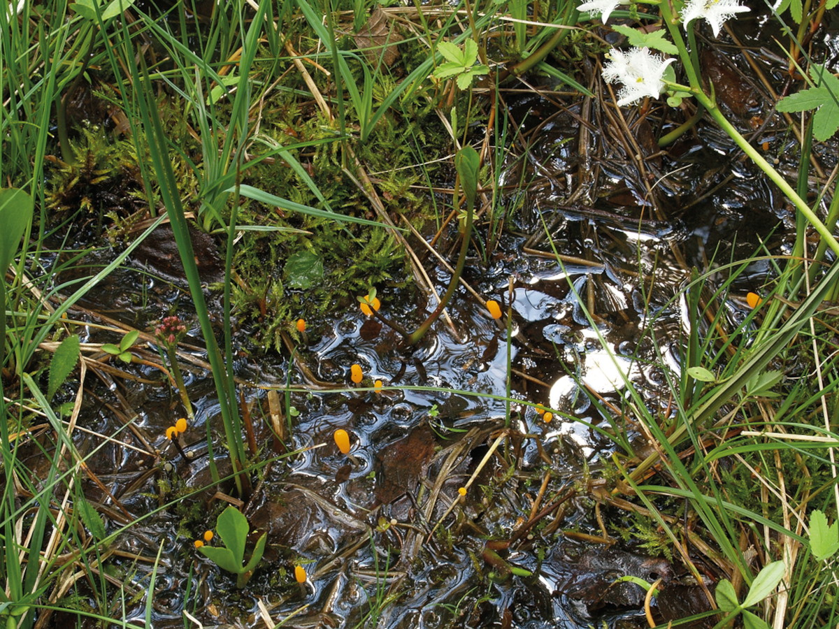 Von diesem Miteinander profitieren zahlreiche Lebewesen – nicht zuletzt die Naturobjekte des Jahres 2023 Moorbirke, Kleiner Wasserfrosch, Alpen-Smaragdlibelle und Sumpf-Haubenpilz.
