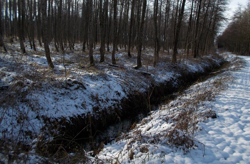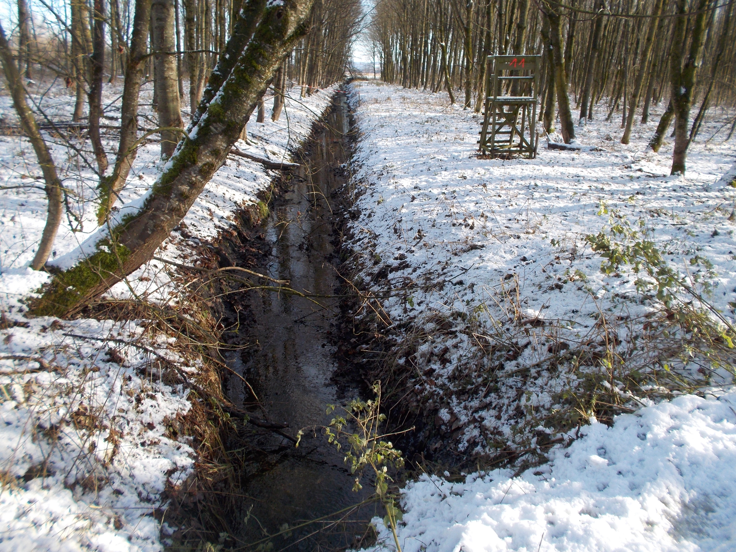 Auch daher ist die Vernässung der Niedermoore wesentlich komplizierter als die der Hochmoore. Ein bloßes Verschließen der Gräben reicht in aller Regel nicht aus: In manchen Mooren ist der Grundwasserspiegel so tief abgesenkt, dass die Gräben heute teilweise trockengefallen sind und man sie somit nicht mehr anstauen kann. Doch selbst in Niedermooren mit Entwässerungsgräben (Abbildung 2) muss einiges beachtet werden, da diese neben dem Grundwasser auch vom Niederschlagswasser der Umgebung und zum Teil auch von Quellen versorgt werden. Durch das (unbedachte) Verschließen von Gräben können folglich bei Niederschlagsüberschuss ungewollte Überflutungen der angrenzenden Flächen und die temporäre Entstehung regelrechter “Seenlandschaften” drohen, mit entsprechenden wirtschaftlichen Schäden. Die Wiederherstellung von funktionierenden Niedermooren ist also in Bezug auf die Herstellung hydrologischer Verhältnisse sowohl technisch als auch gesellschaftspolitisch in der Regel wesentlich komplexer.