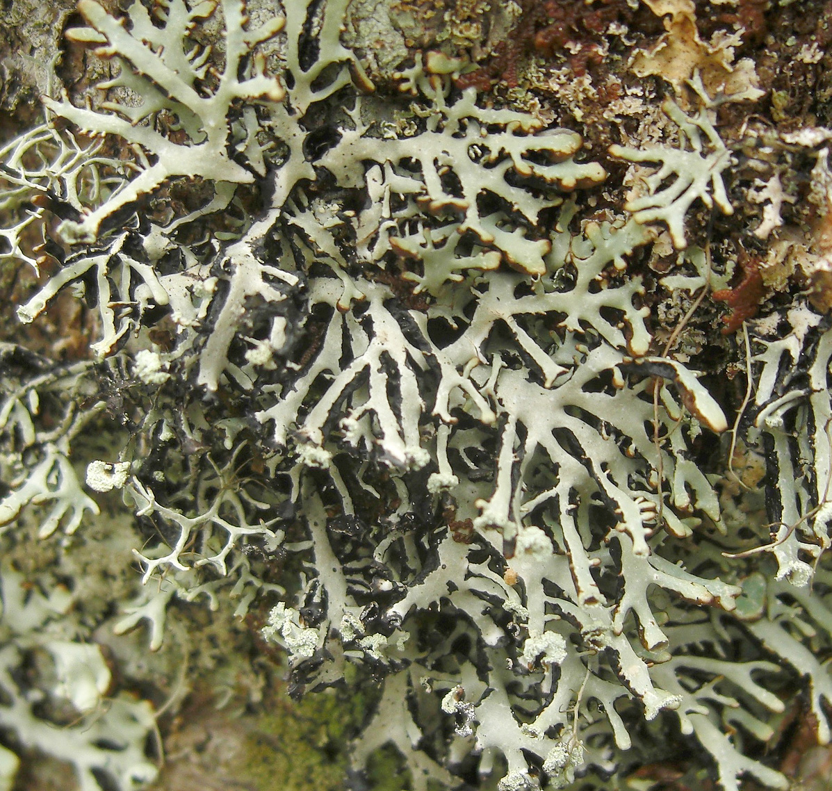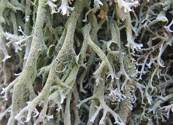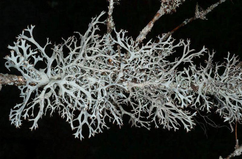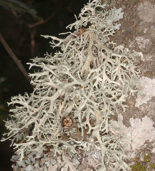 Arten aus der Gattung der Blasenflechten sind ebenfalls oberseits hellgrau und unterseits schwarz. Der Name Blasenflechte bezieht sich auf die hohlen Thalluslappen oder -äste. Die meisten Blasenflechtenarten zählen zu den Blattflechten. Die Gebänderte Blasenflechte (Hypogymnia vittata) hat jedoch sehr schmale Thalluslappen, die an eine Strauchflechte erinnern. Im Vergleich zur Elchgeweihflechte ist die Art seltener, teilt sich aber mit ihr in hochmontanen bis subalpinen Lagen hin und wieder den Trägerbaum. Die Gebänderte Blasenflechte wächst jedoch eher dem Substrat anliegend bis aufsteigend. Foto: Jason Hollinger, Wikimedia, Creative Commons