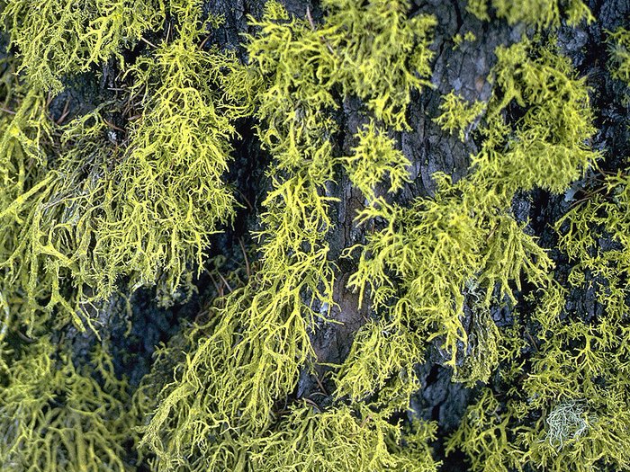 Das Eichenmoos wächst häufig zusammen mit der Elchgeweihflechte, kommt aber auch oft an Laubbäumen vor. Sie hat aber oberseits hellgrüne und unterseits weisse Äste und keine Isidien. Vegetativ vermehrt sich die Art über sogenannte Soredien, winzige Körnchen, die wie Kolonien von Staub auf den Ästen erscheinen. Foto: Christoph Scheidegger (WSL)