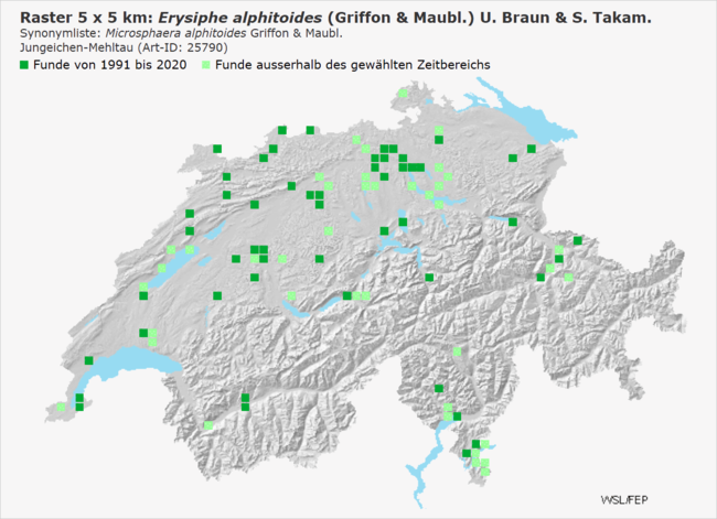 Die Verbreitungsgebiete der drei Arten überlappen sich stark. Alle drei Eichenmehltau-Arten sind auch aus der Schweiz bekannt und bis auf E. quercicola, der vorerst nur im Kanton Tessin nachgewiesen wurde, weit verbreitet. E. alphitoides ist auch in der Schweiz die häufigste Art und kommt wohl fast überall vor, wo es Eichen hat (Abb. 3).