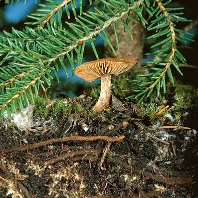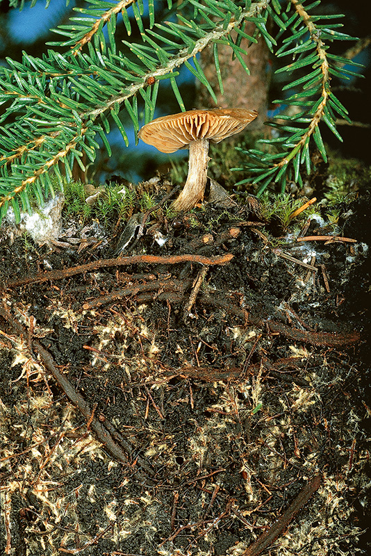Abb. 1. Mykorrhizasymbiose zwischen dem Dunkelscheibigen Fälbling (Hebeloma mesophaeum) und einer Fichte. Fotos: Simon Egli (WSL)