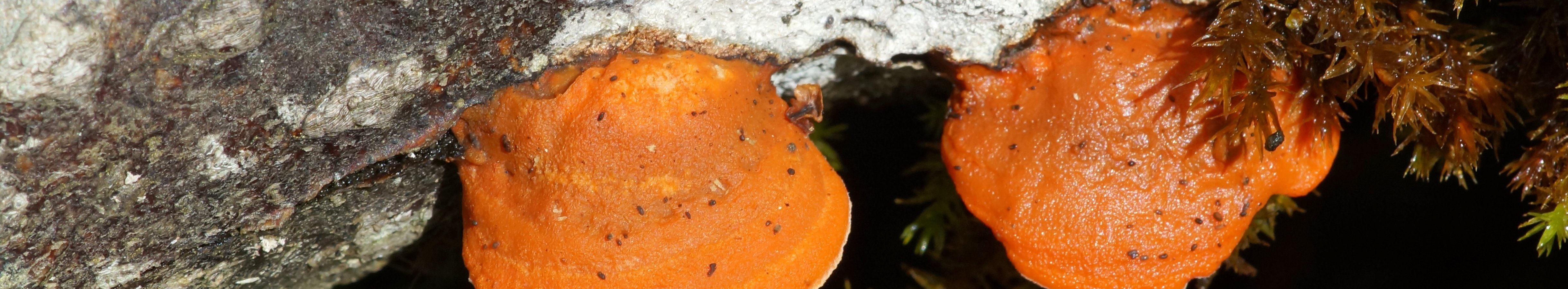 Abb. 2 - Der Blutrote Weiden-Lackpilz (Cytidia salicina) wächst ausschliesslich an Weiden – oft an alten und kränkelnden – bevorzugt an luftfeuchten Wald-, Bach- und Teichrändern. Foto: Beatrice Senn-Irlet