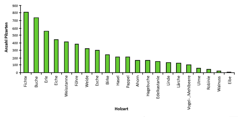 Umgekehrt entsteht bei Feldarbeiten oft der Eindruck, gewisse Baumarten seien pilzreicher als andere. Falinski et al. (1996) teilen denn auch die Baumarten des Nationalparks Bialowieza in Polen in pilzartenarm und pilzartenreich ein. Die umfangreiche Pilzdatenbank der schweizerischen Pilzkartierung bietet die Gelegenheit, die Artenvielfalt der Holz abbauenden Pilze pro Holzart für die Schweiz zu analysieren.