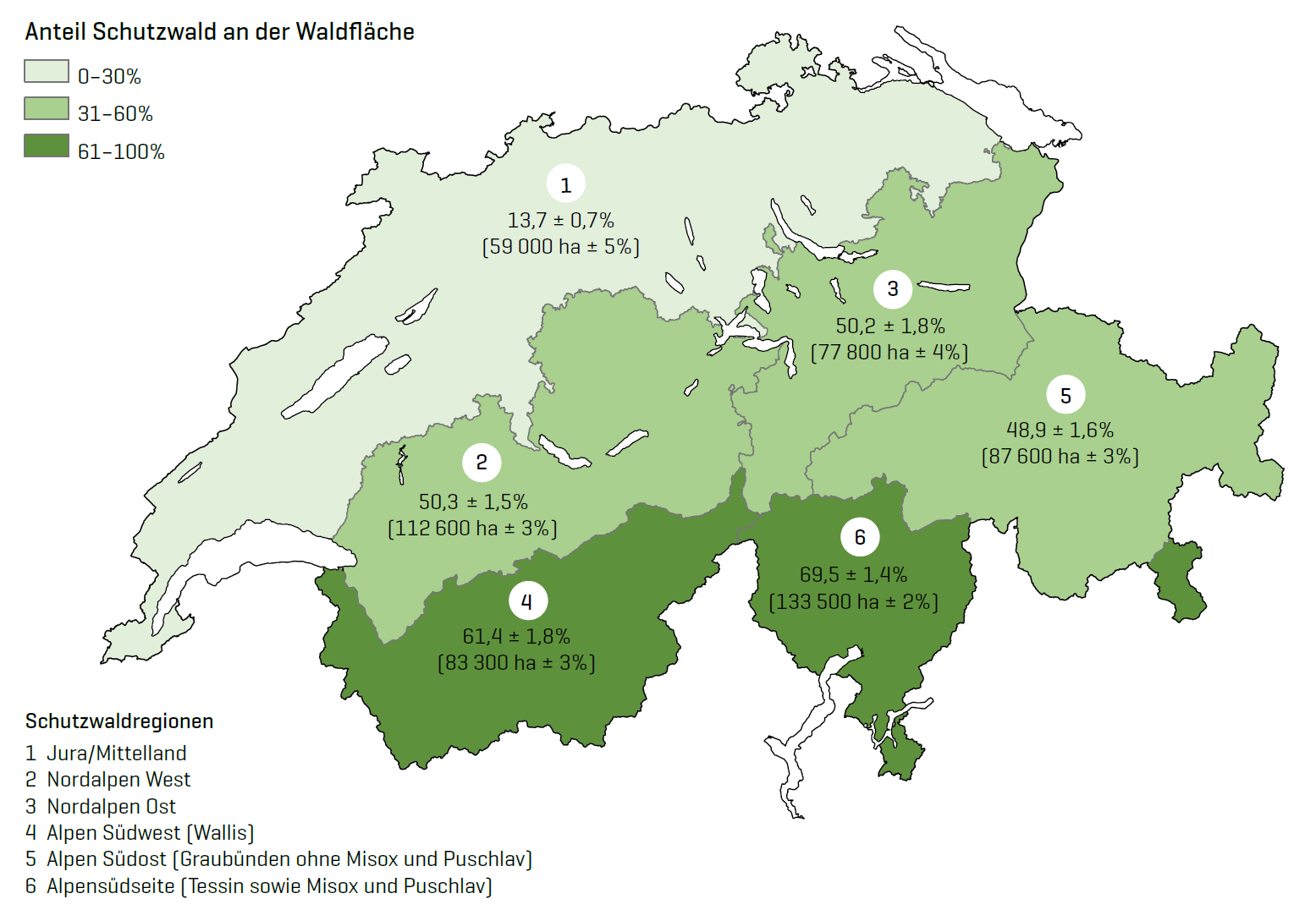 Gemäss SilvaProtect-CH sind 49% des Schweizer Waldes oder 585'000 ha Schutzwald. Im Landesforstinventar LFI wurden die schadenrelevanten Prozessflächen im Wald von SilvaProtect-CH mit der Waldfläche gemäss LFI4 (Aufnahmen 2009–2017) verschnitten. Daraus resultiert ein Schutzwaldanteil von 42% oder 553'800 ha Schutzwald. Die Unterschiede rühren zum kleineren Teil daher, dass im LFI gewisse Arrondierungen, die die Kantone vorgenommen haben, noch nicht berücksichtigt sind, und zum grösseren, dass die Waldausscheidung nicht nach den gleichen Kriterien erfolgte.