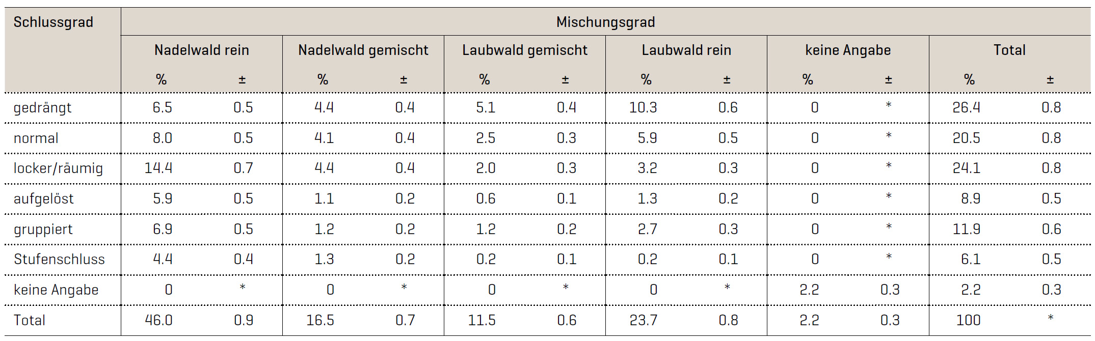 Tab. 1 - Schutzwald LFI4 (Mittelwert ± Standardfehler) nach Mischungsgrad und Schlussgrad in Prozent. * Schätzfehler nicht berechenbar.