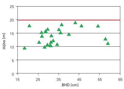 Abbildung 2: Diagramm der Baumhöhen und -durchmesser im Steinschlag-Entstehungsgebiet des Reservates.