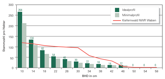 Abbildung 3: Soll-Stammzahlverteilung für ideale Steinschlagschutzwirkung (grün) und tatsächliche Stammzahlverteilung des Karbonat-Kiefernwaldes im NWR Waben (rot)