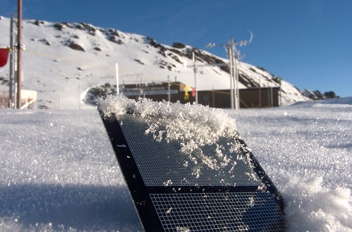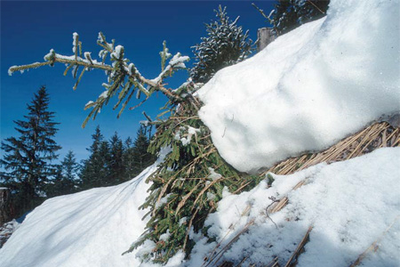 - Weil kein Freiluftklima herrscht, gibt es im Wald eine geringere Abstrahlung während der Nacht. Dadurch bildet sich im Wald weniger Oberflächenreif (Abb. 4). Oberflächenreif besteht aus blattförmigen, grossen, zerbrechlichen Eiskristallen, welche sich nach sternklaren Nächten auf der unterkühlten Schneeoberfläche bilden. Eingeschneite Oberflächenreife bilden eine ideale Gleitschicht für Lawinen. Zusätzlich sind die Temperaturunterschiede innerhalb der Schneedecke im Wald geringer als im Freiland. Die Bildung von unstabilem Schwimmschnee in bodennahen Schichten kommt im Wald deshalb weniger häufig vor.