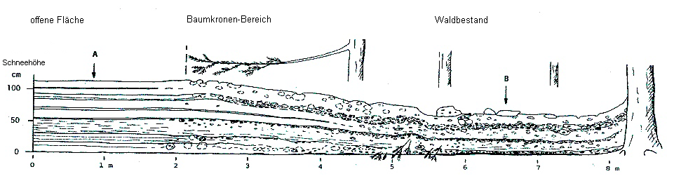 - Ein Wald fängt beträchtliche Mengen des Neuschnees in seinen Baumkronen auf (Abb. 1 und 2). Dieser verdunstet entweder direkt auf dem Baum oder gelangt früher oder später in Form von Schneeklumpen oder Schmelzwasser in die Schneedecke. Man nennt dies Schnee-Interzeption. Im geschlossenen Waldbestand wird die Schneedecke dadurch deutlich weniger mächtig und ist stärker strukturiert als im offenen Gelände (Abb. 3). Die herunterfallenden Schneeklumpen, Wassertropfen, Nadeln und Äste verdichten die Schneedecke. Durch diese Störung der Schneedecke bilden sich weniger zusammenhängende, schwache Schneeschichten.