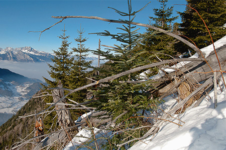 - Baumstämme, Wurzelstöcke, aber auch liegende Bäume helfen mit ihrer abstützenden Wirkung, die Schneedecke zu stabilisieren und erhöhen die Rauigkeit des Bodens. Sogar in nicht oder nur wenig geräumten Windwurfflächen wurden bisher kaum Lawinenanrisse beobachtet.