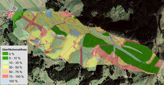 Abbildung: Generell haben Waldbestände geringere Abflussbeiwerte (in % des Niederschlags) als andere Landnutzungsformen. Die vernässten Waldbestände im vorderen Teil des Einzugsgebietes tragen wenig zum Hochwasserschutz bei. In den Waldbeständen im hinteren Teil des Einzugsgebietes entsteht kaum Oberflächenabfluss
