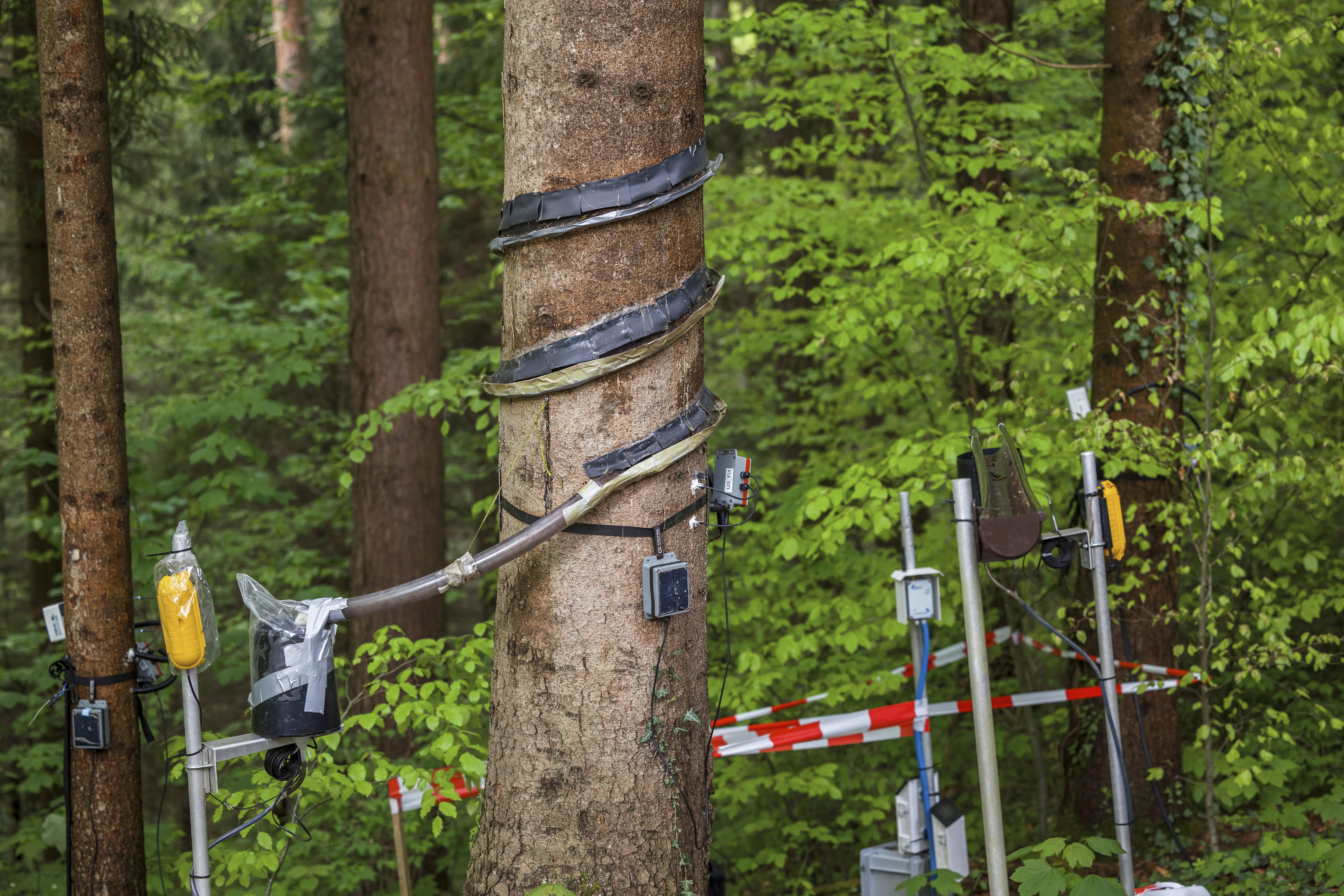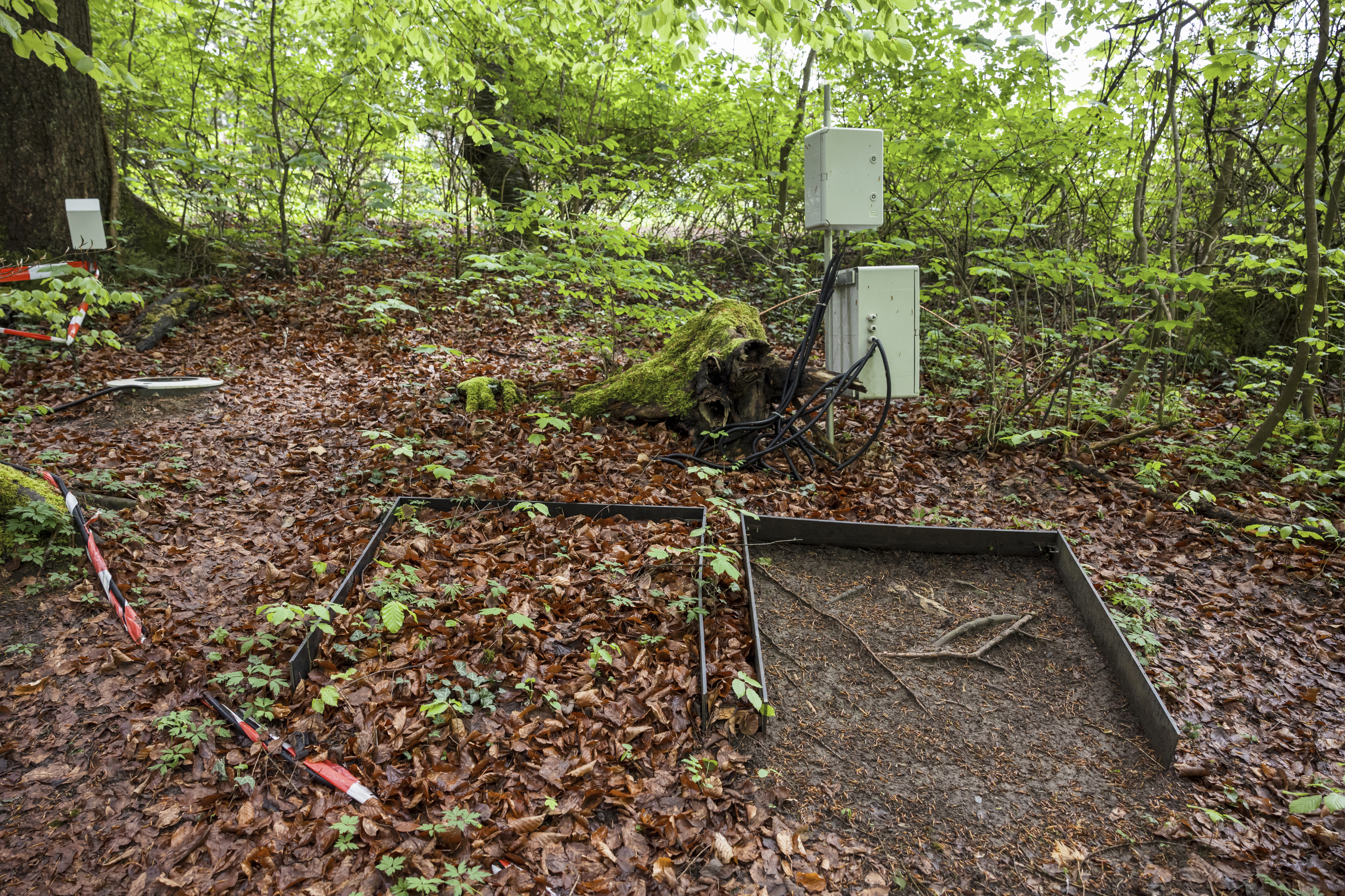 Vertiefte Analysen im Waldlabor Zürich zeigten, inwieweit die Bäume ihre Wasseraufnahmetiefe bei zunehmender Trockenheit verändern. Es wurde ein seltener Einblick ermöglicht: um Saftfluss- und Dendrometer-Sensoren an flacheren und tieferen Wurzeln zu installieren, wurde der Wurzelraum einzelner Fichten und Buchen freigelegt. Saftflusssensoren messen die Wassermenge, die durch den Stamm fliesst, Dendrometer zeichnen kontinuierlich Veränderungen im Durchmesser der Wurzeln auf. Die Wurzeln schrumpfen tagsüber und dehnen sich nachts bei Wassersättigung wieder aus.