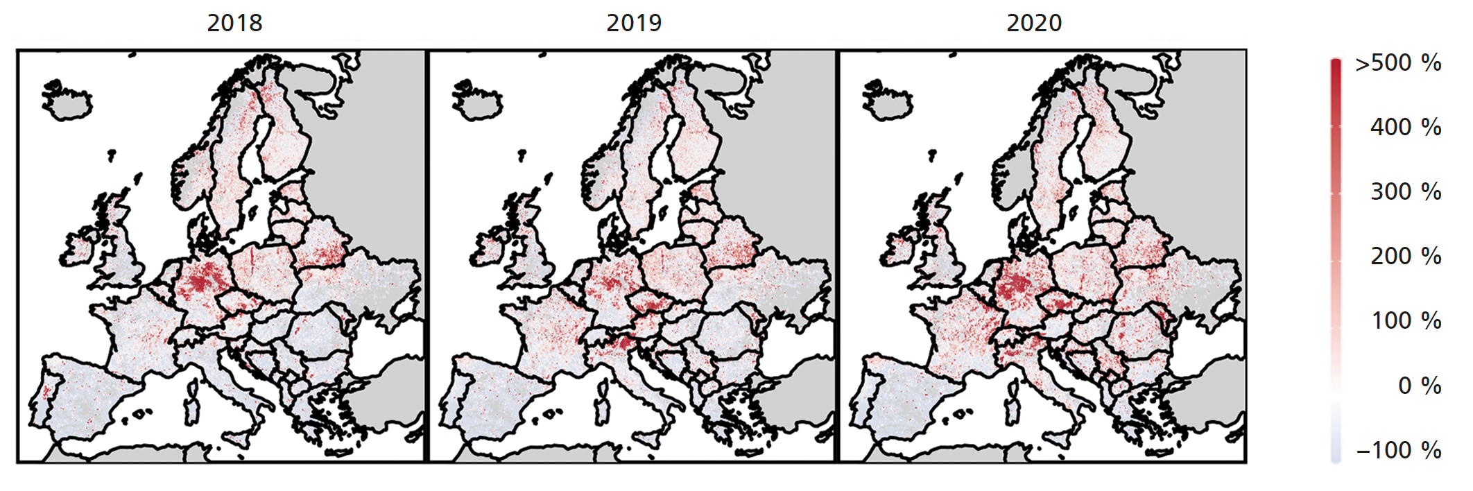 Abb. 2: Übersterblichkeit in Europas Wäldern in den Jahren 2018–2020, relativ zum Mittelwert der Periode 1986–2015. Quelle: Senf und Seidl (2021). Creative-Commons-Lizenz CC BY 4.0.