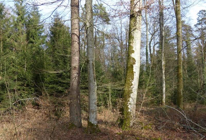 Auch strukturelle Vielfalt (Abb. 4) kann zur Störungsresilienz beitragen, v. a. in Situationen, wo Störungen hauptsächlich die Oberschicht betreffen, wie das zum Beispiel bei Windwurf und Borkenkäfer der Fall ist. Vorhandene Vorverjüngung kann in diesen Fällen die durch Störung frei werdenden Ressourcen nutzen und die Erholungsphase nach Störungen deutlich verkürzen.