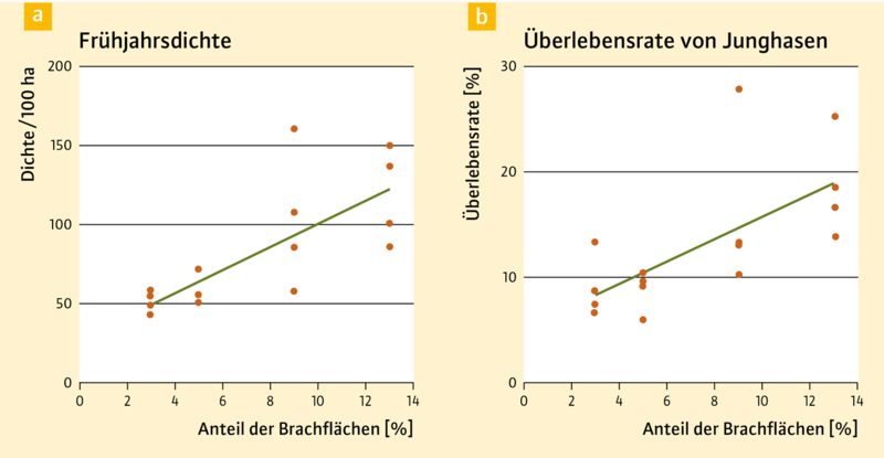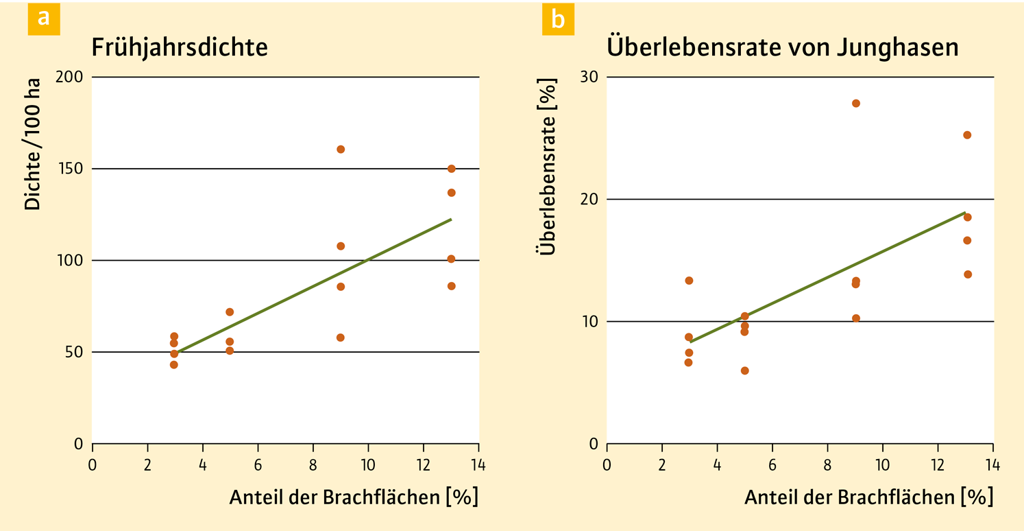 Darüber hinaus wird der Effekt von Witterungsbedingungen und Beutegreifern durch den Verlust von Deckung und Äsung verstärkt. Wie wichtig diese Strukturen sind, unterstreicht eine niederösterreichische Untersuchung, bei welcher die Feldhasendichte positiv mit dem Brachflächenanteil zusammenhängt (Abbildung 4a). Auch die Überlebensrate von Junghasen wird positiv von dem Brachflächenanteil beeinflusst (Abbildung 4b).