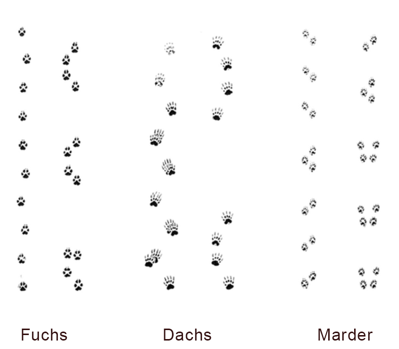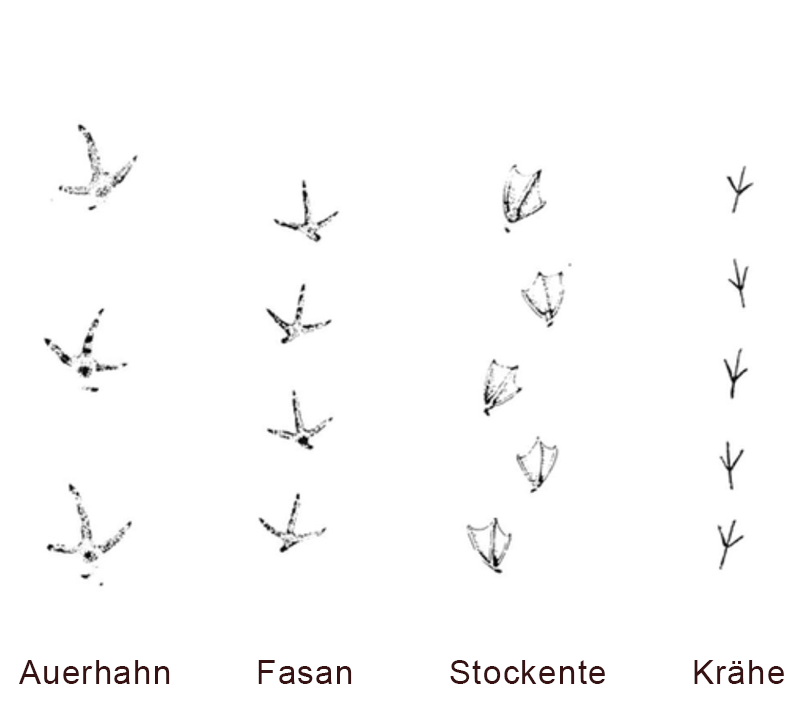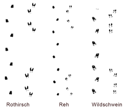 Fährten von Schalenwild (Rothirsch, Reh, Wildschwein), Spuren von Hasen, Eichhörnchen und Raubwild (Fuchs, Dachs, Marder) und Geläufe von Federwild. Spuren von Fuchs, Hund oder Wolf sind schwer zu unterscheiden. Klicken Sie auf die Spuren, um sie grösser zu sehen.