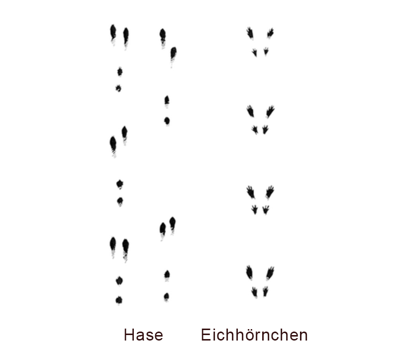 Ganz anders bei den Hasen: Weil sie sich nur in zwei – zudem sehr ähnlichen – Gangarten bewegen, hoppelnd oder flüchtend, zeigen sie eine ganz andere Spur, nämlich den so genannten Hasensprung. Dabei treten sie mit den hinteren nicht in die Tritte der vorderen Gliedmassen, sondern setzen die viel längeren Hinterläufe paarweise vor die kürzeren Vorderläufe. Analog verhält es sich beim Eichhörnchen.