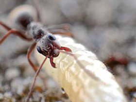 Abb. 1. Arbeiterin der Pelzigen Sklavenameise (Formica selysi) mit einer Larve. Foto: Timothée Brütsch
