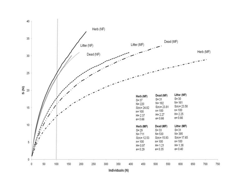 Der Naturwald erweist sich als artenreicher am Waldboden. So wurden bei den Spinnen 50 Arten im Naturwald und 44 Arten in der Vergleichsfläche gefunden. Durch hohe Unterschiede in den Fangzahlen pro Bodenfalle wurde die Diversität, bei gleicher angenommener Fangzahl (n=100), geschätzt. Diese Artenzahlenerwartungswerte weisen auf einen deutlichen Unterschied in der Artenvielfalt hin (Abb. 4).