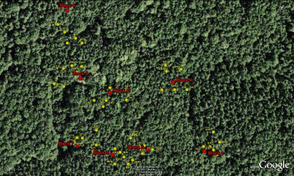 Abb. 3: Anordnungen der Untersuchungsplots (GPS-Punkte) in Blöcken zur Erfassung der Bodenfauna und der Umweltparameter im Naturwald Fünfeichen (Ansicht Naturwaldseite).