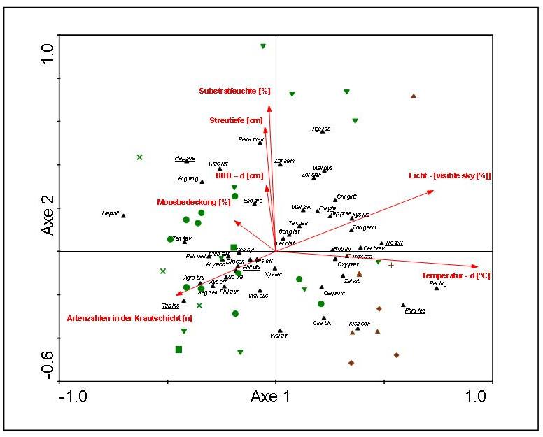 Abb. 5: Haupteinflussfaktoren in der Unterscheidung der Spinnen-Artengemeinschaften (Redundanzanalyse).