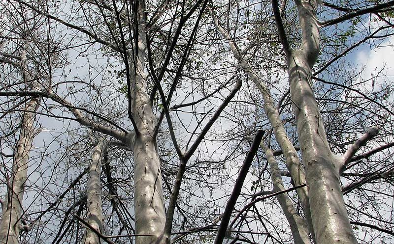 Abb. 1: Von Gespinstmottenraupen kahl gefressene und silbrigweiß eingesponnene Traubenkirschen (Foto: J. Reichholf)