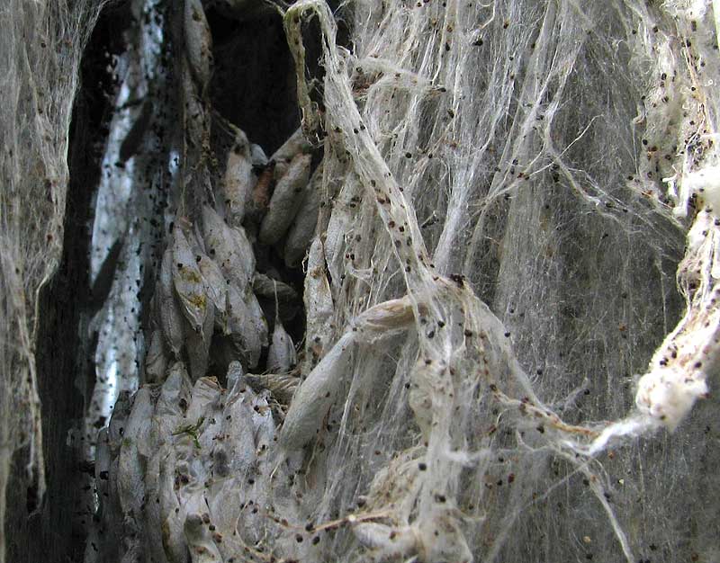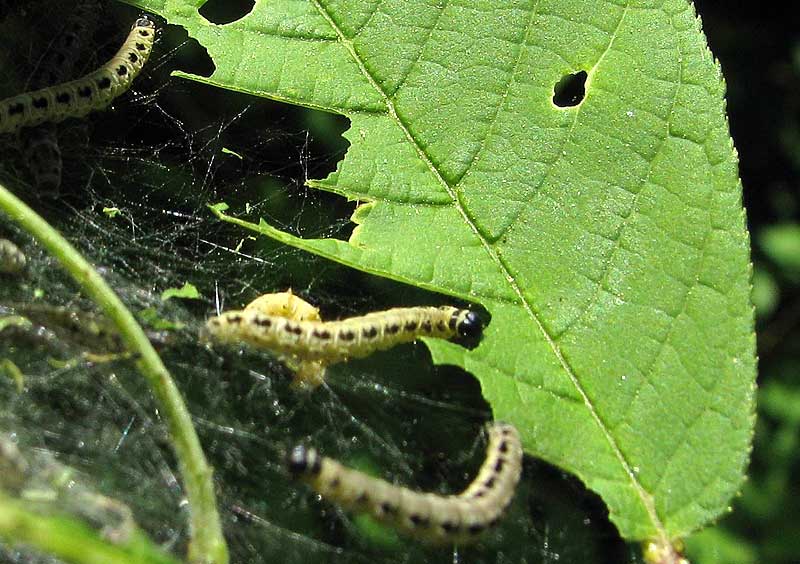 Sobald die gelblichen, schwarz gepunkteten Raupen schlüpfen, befressen sie die Blätter der austreibenden Traubenkirschen (Abb. 3). Gleichzeitig beginnen sie damit an den Zweigspitzen Gespinste zu erzeugen, die weithin auffallen. Mit dem Heranwachsen der Raupen werden diese Gespinste größer und schmutziger (Kotballen). Immer häufiger wechseln die Raupen nun zu anderen Trieben und fressen diese kahl. Sind sie ausgewachsen beginnen sie die Äste und Zweige, schließlich auch den Stamm, mit ihrem silberweißen Gespinst zu überziehen. An vor Nässe geschützten Stellen verpuppen sie sich nun in dichten Massen. Ein einzelner Klumpen kann Tausende von eng an- und übereinander liegenden Puppengespinsten enthalten. Diese werden zusätzlich von einem seidenartigen Schutzgewebe überzogen. Zuletzt fertigen Raupen, die sich nicht mehr verpuppen, letzte Abdichtungsschichten. Diese Schichten schützen vor Nässe, aber auch vor Parasiten (Abb. 4). Entsprechend hoch fallen die Schlüpfraten der Schmetterlinge aus. Die Raupen, welche die Außenschicht fertigen, gehen unverpuppt zugrunde. Diese Hungerraupen hätten keine fortpflanzungsfähigen Falter ergeben.