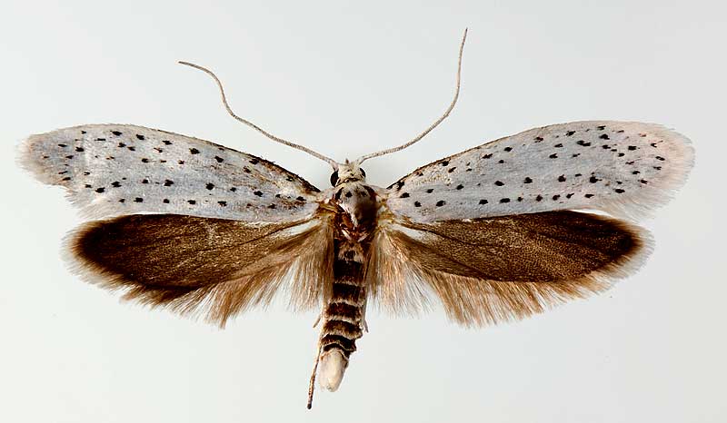 Abb. 2: Falter der Traubenkirschen-Gespinstmotte ist von anderen Arten durch die fünf Reihen feiner schwarzer Punkte auf dem sonst einheitlich silbrigen Vorderflügel zu unterscheiden (Foto: L. Dalen, forestryimages.org).