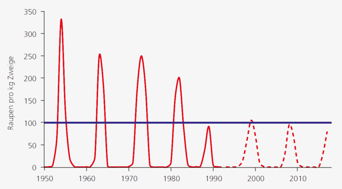 Abb. 3. Zyklische Populationsschwankungen des Lärchenwicklers im Oberengadin. Die Periodizität liegt bei durchschnittlich 8,5 Jahren, die Schwelle für eine sichtbare Verfärbung eines Lärchenbestandes bei 100 Raupen pro Kilogramm Zweige (blaue Linie). Die ausgezogene rote Kurve basiert auf Daten von Baltensweiler (1993a) und Baltensweiler und Rubli (1999), die gestrichelte Linie auf visuellen Schätzungen im Feld.