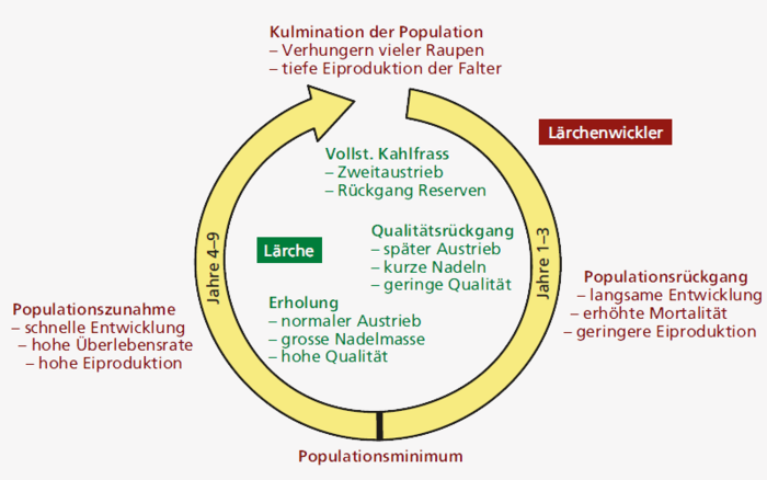 Wie für alle im Eistadium überwinternden, blattfressenden Raupen ist auch für den Lärchenwickler das zeitliche Zusammenfallen des Nadelaustriebs und des Schlüpfzeitpunkts der jungen Räupchen entscheidend. In den Jahren nach einem Massenauftreten treiben die Lärchen später aus und den zum normalen, temperaturgesteuerten Zeitpunkt schlüpfenden Räupchen fehlen die frisch ausgetriebenen, gut verdaulichen Lärchennadeln. So verhungert mindestens der früh schlüpfende Teil der neuen Lärchenwicklerpopulation. Die überlebenden Raupen finden Nadeln geringerer Qualität vor, die schwer verdaubar sind und einen tieferen Nährwert haben. Die Raupen wachsen deshalb langsamer, erreichen weniger Gewicht und erleiden eine höhere Mortalität. Die aus diesen Raupen entstehenden Falter legen bis zu 90 Prozent weniger Eier. Diese verzögerte Rückkopplung führt zu einem drastischen Rückgang der Populationsdichte.